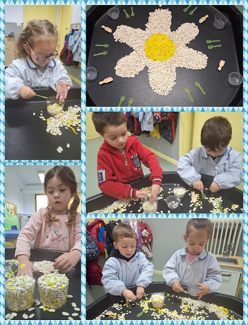 Perfeccionamos la pinza colocando pistachos en los números del 1 al 5 y poniendo garbanzos en las vocales